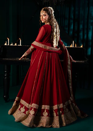 Additional Description: Product Details Include: Pishwas & Duptta Color: Maroon Fabric: Chiffon Work Technique: Embroidery & Embellishment Style: 2 Piece Stitched Outfit DESCRIPTION: Embrace The Everlasting Elegance Of Noore, Where Tradition Meets Refinement. Crafted In Rich Maroon Chiffon, This Beautiful Pishwas Is Ornamented With Zari, Resham, And Sequin Needlework, Adding A Heavenly Glow To Its Artistry. The Intricately Embroidered Front And Back, Body, And Sleeves Radiate Sophistication, While The Five-Yard Flared Hem Flows Effortlessly, Making A Grand Silhouette. A Stitched Malai Inner Safeguards Ease And Opacity, Making Every Movement As Easy As It Is Elegant. The Ensemble Is Completed With A Chiffon Dupatta, Festooned With Four-Sided Embroidery, And Subtle Lace Detailing In The Kalis, Making Noore A Joyful Ode To Heritage And Eternal Beauty.