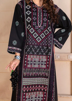 Additional Description: Twilight tales told in thread and tradition. Make a statement in this dramatic black A-line frock, adorned with intricate geometrical cross-stitch embroidery. The neckline features a graceful slit, accentuated with embroidered organza appliqué, delicate lace trimmings, and composed embroidery for a refined finish. The frock flows from neck to hem in a beautifully composed multi-head cross-stitch design, enhanced with embroidered organza patchwork and finished with subtle lace along the hemline for an added touch of elegance. The plain back maintains a sleek, structured silhouette. Full-length sleeves are detailed with embroidered spray motifs, bordered embroidery, and shimmering lace accents at the openings for a graceful look. Paired with straight trousers in textured cambric, featuring wide embroidered organza borders and neat pleats at the hem—balancing elegance with comfort. A sleeveless, round-neck slip in breathable lawn is included, offering effortless layering for any occasion.